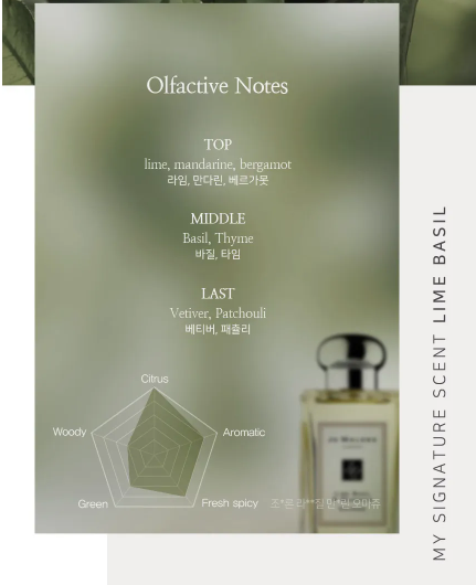 Lime Basil: A refreshing green citrus scent//Top: Lime, Mandarine, Bergamot; Middle: Basil, Thyme; Last: Vetiver, Patchouli