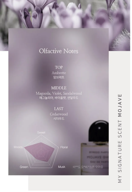 Mojave: An aromatic woody musk scent.//Top: Ambrette; Middle: Magnolia, Violet, Sandalwood; Last: Cedarwood